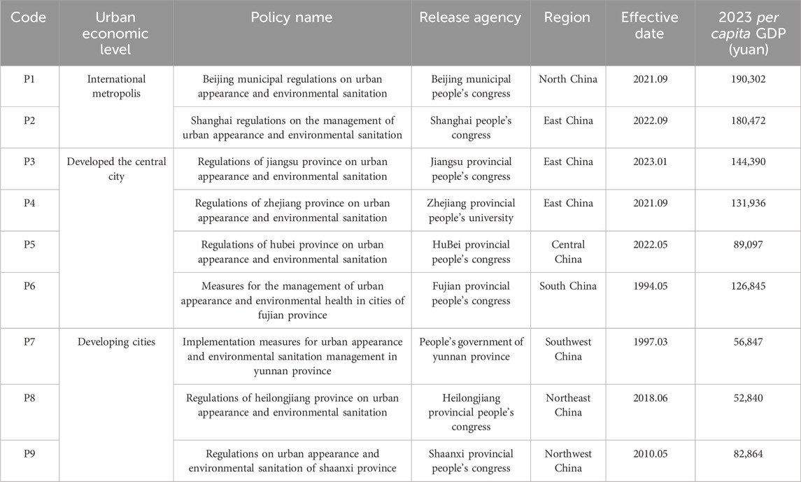 To address these pressing issues, the Chinese government has implemented a series of policies and regulatory frameworks that encompass urban planning, infrastructure development, and day-to-day management. While these policy initiatives have led to incremental improvements in urban appearance and sanitation, implementation gaps persist, including inadequate policy enforcement and deficient inter-agency coordination (Ming et al., 2024). Consequently, analyzing the effectiveness and limitations inherent in China’s urban appearance and environmental sanitation policies is pivotal for distilling generalizable policy principles and recommendations, thereby contributing to the enhancement of urban governance efficacy.