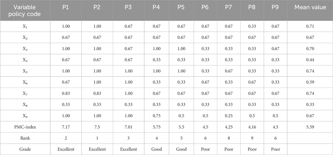 Based on the number of primary variables and with reference to the evaluation criteria in previous studies (Xu et al., 2025), the PMC index scores are specifically divided into the following five levels: a PMC index score of 9 indicates a perfect policy; a score ranging from 7 to 8.99 indicates an excellent policy; a score from 5 to 6.99 indicates a good policy; a score between 3 and 4.99 indicates a poor policy; and a score from 0 to 2.99 indicates a severely poor policy.