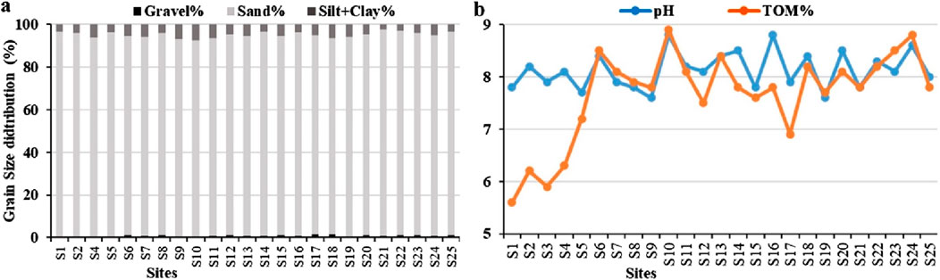 Figure 2. Spatial variations in sediment grain size (%) distribution (a), pH and total organic matter (TOM%; (b)) in sediments of W. Ghadir outlet, Red Sea coastline.