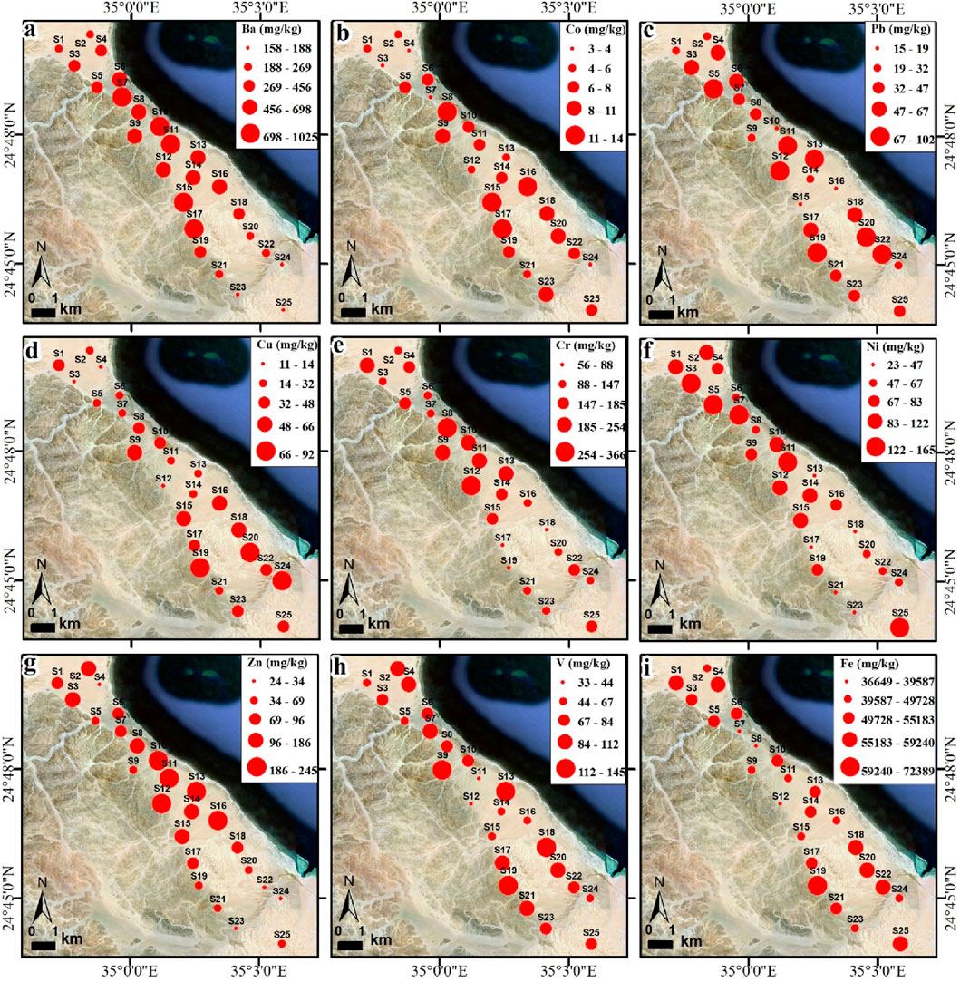 Figure 3. Spatial pattern of metal contents (mg/kg) in coastal sediments of W. Ghadir outlet: Ba (a), Co (b), Pb (c), Cu (d), Cr (e), Ni (f), Zn (g), V (h), and Fe (i).