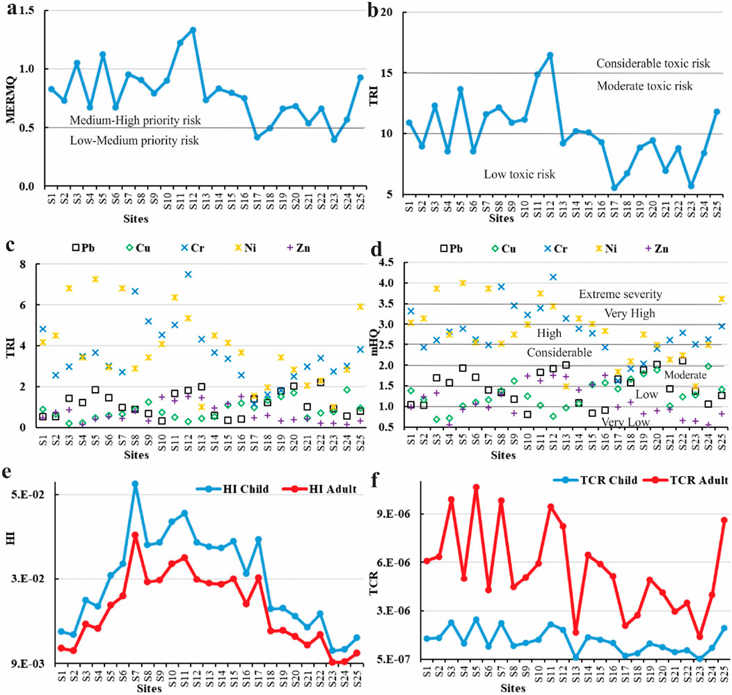 Figure 6. The values of SQG mean effects range median quotient (MERMQ: (a)); toxic risk index (TRI: (b,c)); modified hazard quotient (mHQ: (d)); human health non-carcinogenic risk index (HI: (e)); and human health carcinogenic risk index (TCR: (f)) of the investigated metals in coastal sediments of W. Ghadir outlet, Red Sea.