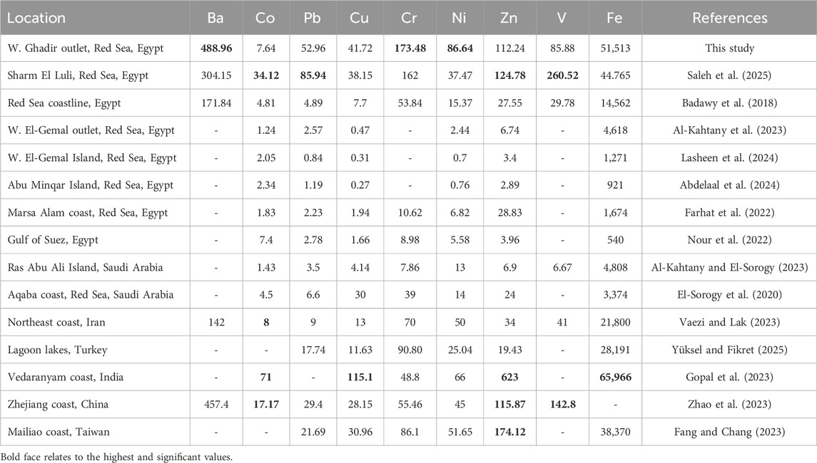 Table 2 compares the mean metal contents in W. Ghadir sediments with those of Egyptian and global coastal sediments. The W. Ghadir average Ba, Cr, and Ni contents surpassed those found in Egypt’s and other countries’ coastal sediments (Al-Kahtany et al., 2023; Badawy et al., 2018; Nour et al., 2022; Yüksel and Fikret, 2025) (Table 2). However, the average contents of Co, Pb, Cu, Zn, V, and Fe in this study were lower than those in Sharm El Luli, Red Sea, Egypt, India and China’s coastal sediments (Gopal et al., 2023; Fang and Chang, 2023; Saleh et al., 2025) (Table 2).