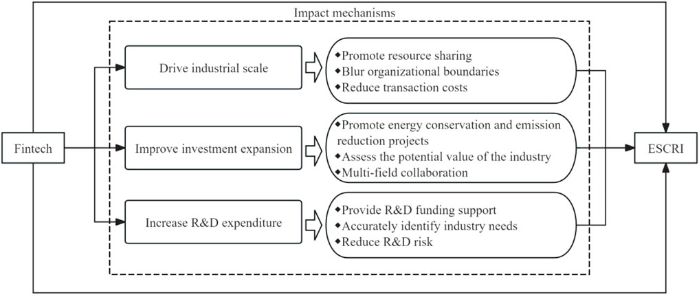 Although existing studies have confirmed the carbon reduction effects of fintech (Cheng et al., 2023; Teng and Shen, 2023; Wan et al., 2025), they have largely overlooked the mechanisms through which fintech influences ESCRI. This study addresses this gap by thoroughly examining the critical roles of industrial scale, investment expansion, and R&D expenditure in shaping the relationship between fintech and ESCRI. For a detailed theoretical framework, refer to Figure 1.