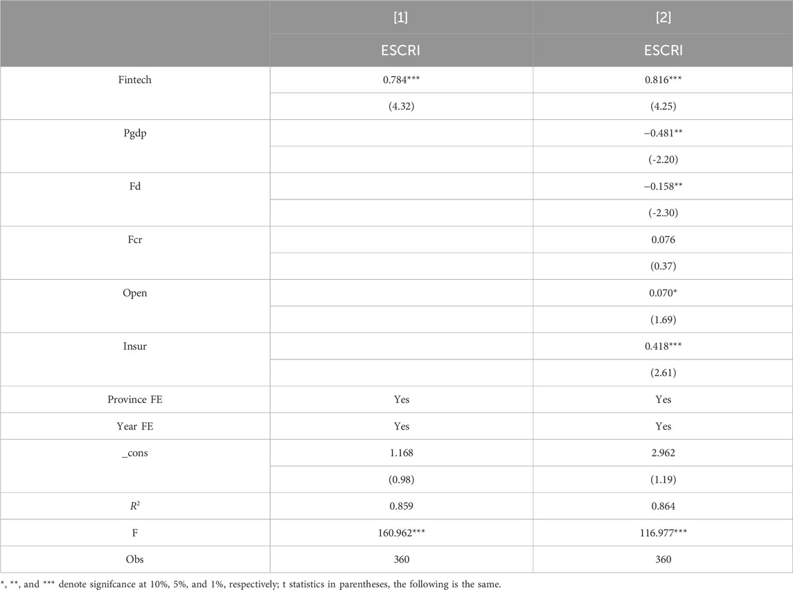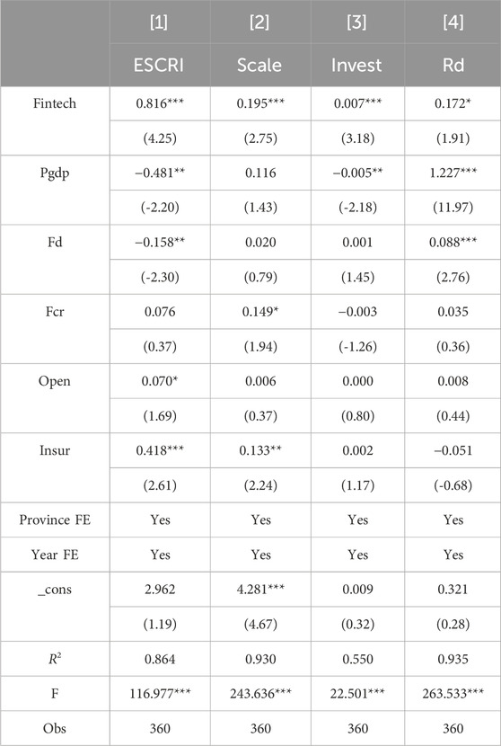Table 2 demonstrates the baseline regression results for fintech and ESCRI. Column [1] illustrates the regression result without control variables. The results show that the regression coefficient of fintech is significantly positive. After adding control variables, the regression coefficient of fintech in Column [2] becomes 0.816 and significantly positive at the 1% statistical level. This finding indicates that fintech significantly promotes ESCRI, confirming Hypothesis 1. Previous studies have investigated the positive effect of fintech on green innovation from the enterprise level (Huang and Ma, 2024; Li Y. et al., 2024). The results obtained from the macro level in this study are mutually corroborative.