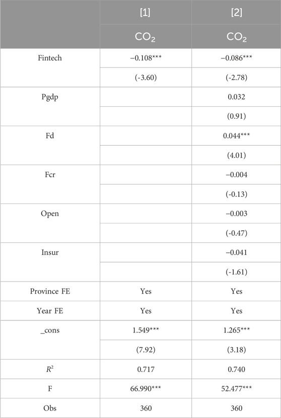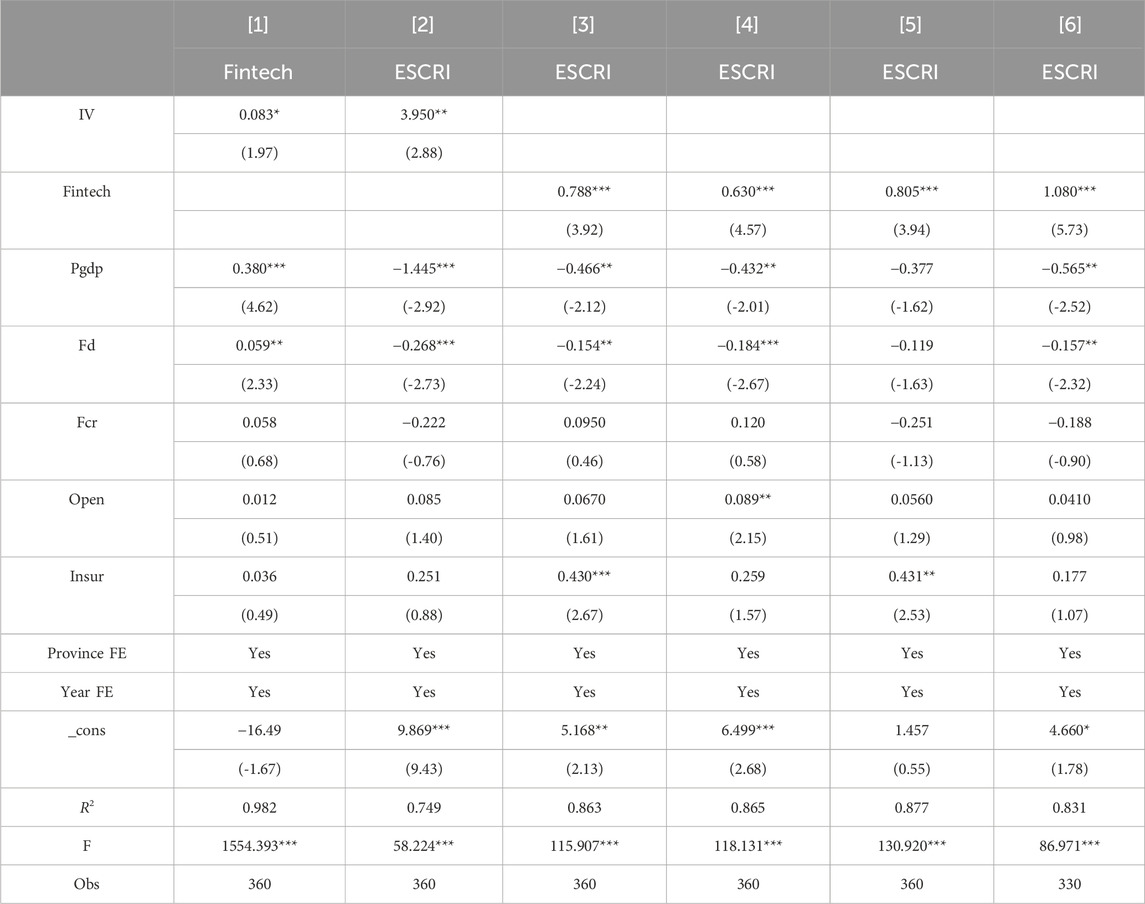 Fintech offers financial support for green and low-carbon initiatives, thereby playing a pivotal role in improving environmental quality (Udeagha and Muchapondwa, 2023). In addition, it drives technological innovation within the financial sector and increases the share of clean energy consumption in economic activities, further aiding in the carbon reduction (Li G. et al., 2023; Xu et al., 2023). This study delves deeper into the carbon emission reduction effects of fintech, the findings of which are presented in Table 6. Column [1] displays the regression results without control variables, revealing a significantly negative regression coefficient for fintech. Upon incorporating control variables, the regression coefficient in Column [2] is −0.086, which remains significantly negative at the 1% statistical level. This finding underscores that fintech effectively curbs carbon emissions, demonstrating a clear carbon abatement effect. Our findings are consistent with the results reported by Tao et al. (2022) and Xu et al. (2023). Building on these insights, we conclude that fintech significantly contributes to carbon emission reduction by enhancing ESCRI levels.