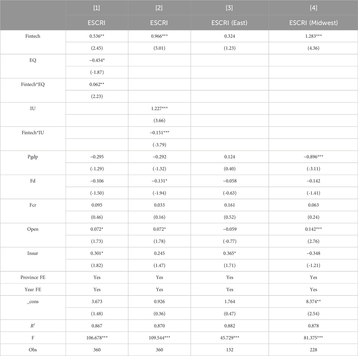 In China, the central and western regions experience relatively slower economic growth than their eastern counterparts, primarily due to disparities in regional endowments (Bi et al., 2024). The traditional financial system has often been less accommodating to these less developed areas (Du, 2017). However, the advent of fintech has effectively addressed these gaps, significantly benefiting the economic development of the central and western regions (Jin, 2017; Ye et al., 2022). In this study, the sample is divided into eastern and midwestern regions based on standard geographical classifications. Columns [3]–[4] of Table 5 present the findings on regional disparities. The regression coefficients for fintech in the eastern region sample do not exhibit statistical significance. On the contrary, in the midwestern sample, the regression coefficient for fintech is 1.283, which is significant at the 1% level. These results indicate that fintech plays a more crucial role in enhancing ESCRI in the Midwest than in the East.