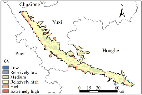 The Coefficient of Variation (CV), defined as the ratio of the standard deviation to the mean of a dataset, was employed to assess the stability and volatility of time series data. In this study, we calculated the CV for the Yuanjiang dry–hot valley area from 2000 to 2020 using the following formula to evaluate its temporal stability: