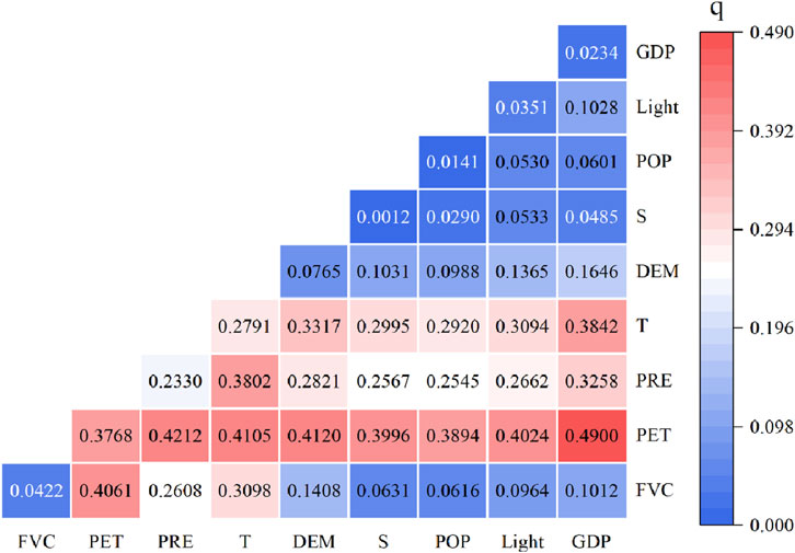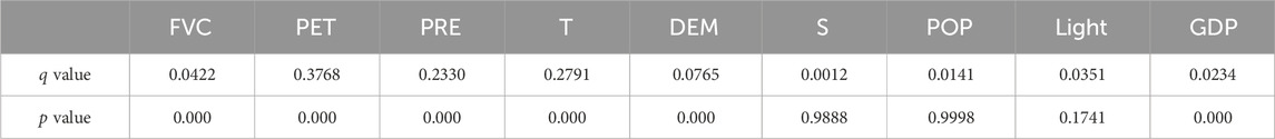 The q–value measures the explanatory power of a given factor on TVDI, ranging between 0 and 1. Higher values indicate stronger explanatory strength regarding TVDI variations, while lower values denote weaker influence. The p–value reflects factor significance, where values below 0.05 indicate statistically significant effects.