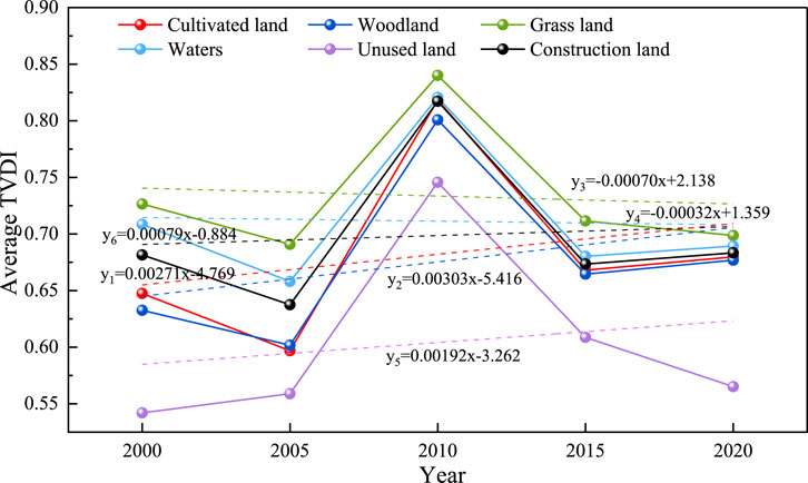 The mean TVDI values for each land use type from 2000 to 2020 were extracted. Statistical analysis was then conducted in conjunction with the land use types to determine the changing relationship between different land use types and TVDI (Figure 9). The mean TVDI values for grassland were consistently higher than those for other land use types. The increase in grassland area corresponded with intensified drought. The mean TVDI values for unused land were consistently lower than those for other land use types. The decrease in unused land area corresponded with intensified drought. The TVDI values for woodland and cultivated land were relatively close to each other and comparatively lower, indicating their relatively stronger water and soil conservation capacity. Between 2000 and 2020, the TVDI for cultivated land, woodland, unused land, and construction land showed an overall upward trend. In contrast, the TVDI for grassland and water bodies showed a downward trend, albeit a relatively gentle one.
