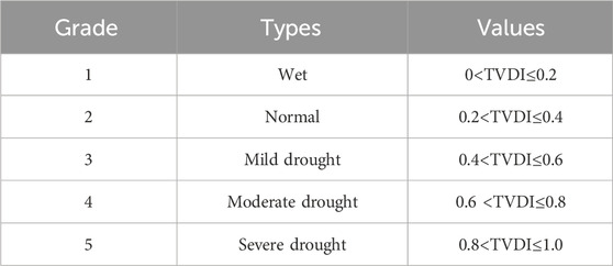 where, a1 and b1 are the coefficients of the wet edge equation, while a2 and b2 are the coefficients of the dry edge equation. The TVDI has a value range of (−1, 1) and reflects the moisture status of surface soil. An increase in TVDI indicates reduced soil moisture and heightened drought conditions in the area, while a decrease signifies higher soil moisture and wetter conditions. Values closer to 1 denote more severe soil drought, whereas values approaching 0 indicate higher soil moisture levels. Based on previous studies and the current conditions of the study area (Huo et al., 2025; Li et al., 2025), the TVDI was classified into five grades, as shown in Table 1.