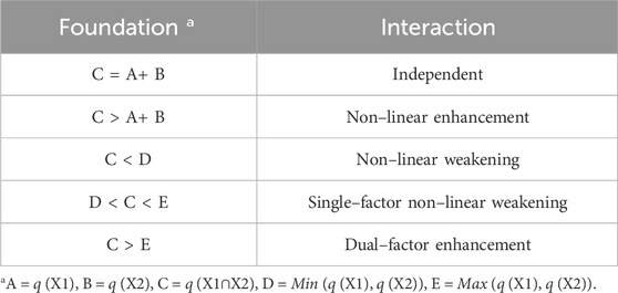 Interaction detector was used to assess interaction between two factors. The q values of individual factors (q (X1) and q (X2)) were first calculated separately, and the value of two–factor interaction (q (X1 ∩ X2)) was calculated. The results are defined by comparing the q value of individual factor and two–factor interaction as shown in Table 2.