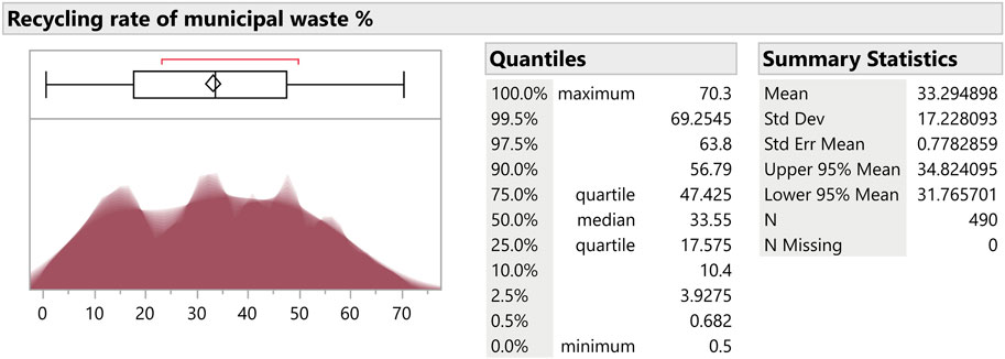 The minimum observed recycling rate was 0.5%, reflecting extremely low levels of recycling in certain cases, most likely corresponding to the early years of the observed period or to less developed countries. In contrast, the maximum value of 70.3% indicated that some countries had already achieved highly advanced levels of recycling, aligning closely with the European Union’s circular economy objectives. The 95% confidence interval for the mean ranged from 31.77% to 34.82%, further supporting the reliability of the average estimate.