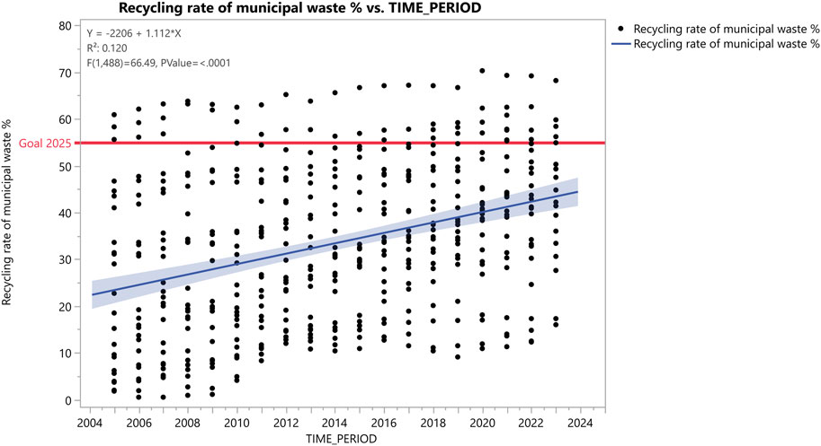 2. Trend analysis–In order to capture temporal dynamics, a simple linear regression was applied, with the calendar year as the independent variable and the recycling rate as the dependent variable. The model indicated a positive and statistically significant trend (β = 1.112; p < 0.0001). However, the coefficient of determination reached only R2 = 0.120, which underscored the need to extend the model by incorporating additional explanatory variables.