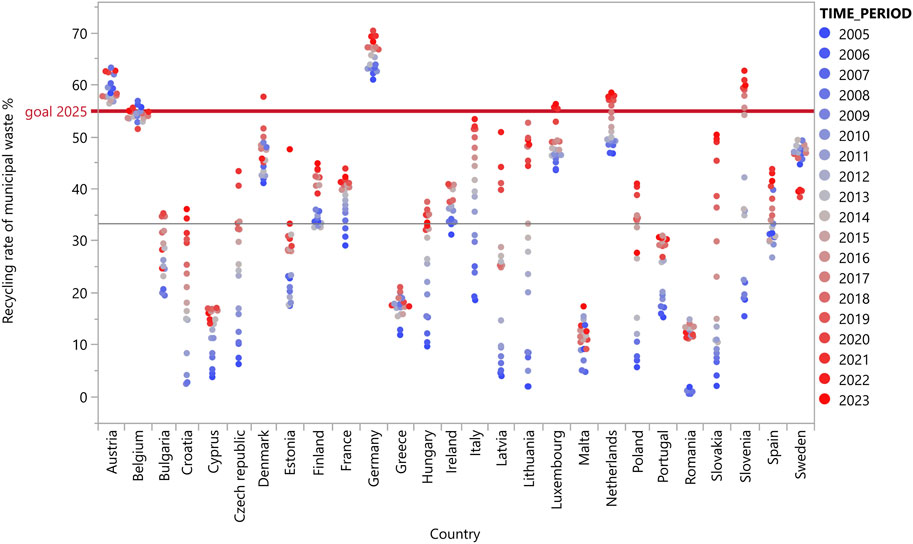 Figure 3. Cross-country comparison of municipal waste recycling rates in EU member states (2005–2023).