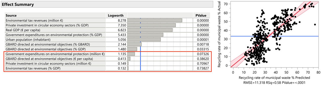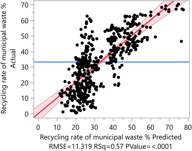 Based on Figure 5, the coefficient of determination (R2) for the regression model was 0.5745, indicating that the selected independent variables collectively captured approximately 57% of the variation in municipal waste recycling. The overall model was found to be highly statistically significant (F(7, 482) = 92.97; p < 0.0001). The mean value of the dependent variable was 33.29%, while the root mean square error (RMSE) amounted to 11.32 percentage points.