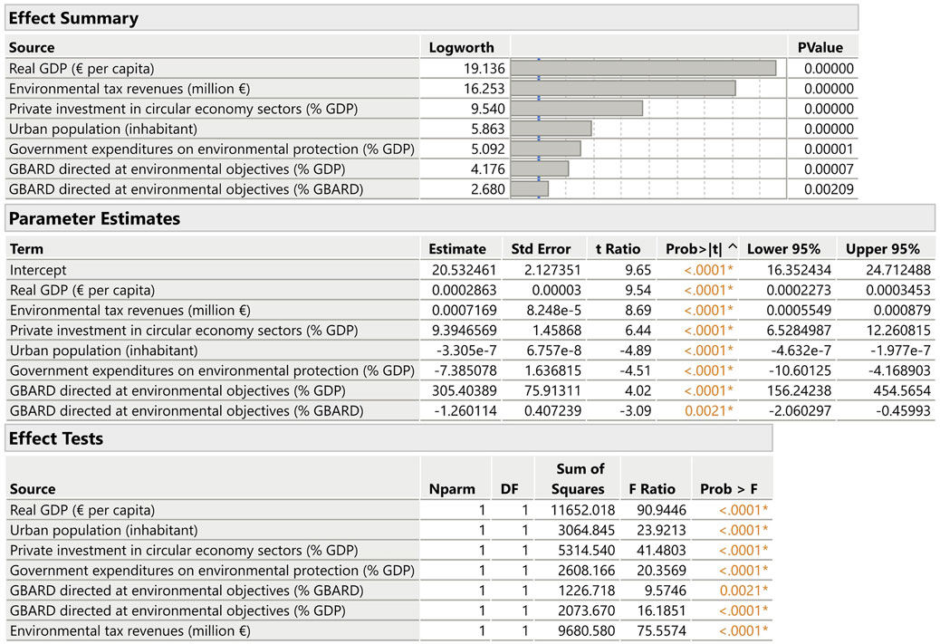 3. Multiple linear regression–The core of the analytical procedure involved multiple linear regression (MLR), which was used to examine the simultaneous associations between the recycling rate (dependent variable) and a set of macro-level factors (independent variables): environmental tax revenues (million €), environmental tax revenues (% GDP), GBARD directed at environmental objectives (% GDP), GBARD directed at environmental objectives (% GBARD), GBARD directed at environmental objectives (€ per capita), government expenditures on environmental protection (% GDP), government expenditures on environmental protection (million €), private investment in circular economy sectors (% GDP), private investment in circular economy sectors (million €), urban population (inhabitant), real GDP (€ per capita).
