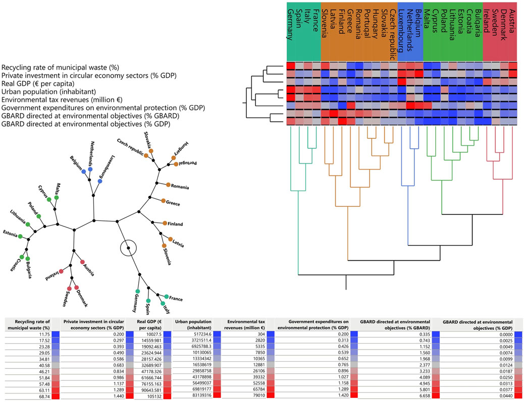 4. Cluster Analysis–To group countries by structural characteristics, Ward’s hierarchical clustering method was applied to column-standardized values (z-scores) of five-year averages for the period 2019–2023 (Kaufman and Rousseeuw, 2009; Everitt et al., 2011). Ward’s method minimizes the within-cluster sum of squares and is defined over the Euclidean distance metric, which was explicitly used in this study (Rokach and Maimon, 2005). The clustering input included the explanatory variables that proved statistically significant in the regression analysis, namely real GDP (€ per capita), urban population size (inhabitants), environmental tax revenues (million €), private investment in circular economy sectors (% GDP), government expenditures on environmental protection (% GDP), and government budget allocations for R&D (GBARD) directed at environmental objectives (% GDP). Recycling rate (%) was used only for profiling the resulting clusters, not for computing distances.
