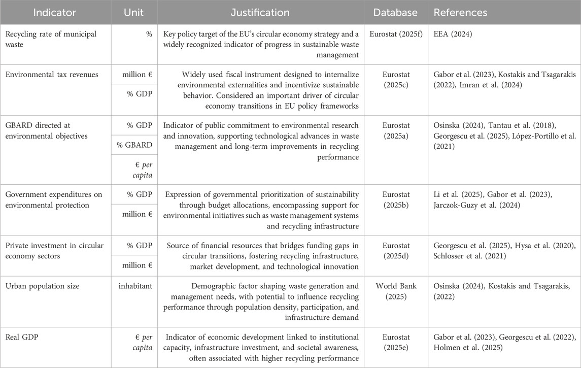 Equally important are government expenditures on environmental protection, which reflect the degree of governmental prioritization of sustainability in budgetary allocations, particularly in supporting infrastructure and shaping household behavior towards waste management (Finnveden et al., 2013). These expenditures can directly fund the development of robust recycling infrastructure, including advanced material recovery facilities and efficient collection systems, while also supporting public awareness campaigns that foster pro-environmental behaviors (Chierrito-Arruda et al., 2018). Their efficacy is often amplified when combined with external incentives, such as monetary rewards or social influence, which are well-established predictors of recycling participation (Hornik et al., 1995; Nikiema and Asiedu, 2022). Evidence from both European and non-European contexts highlights the relevance of public environmental expenditures. In China, such spending promoted drop-off recycling and low-carbon practices (Li et al., 2025), while in the EU studies consistently reported positive effects, with Gabor et al. (2023) identifying government expenditure on environmental protection as a significant determinant of recycling rates, Jarczok-Guzy et al. (2024) confirming similar associations across member states, and Niu (2024) linking this spending to broader outcomes in environmental, social, and governance (ESG) performance, including recycling. Importantly, these effects are shaped by the design and implementation of waste management policies, which mediate public engagement and compliance (Moeini et al., 2023). This highlights the need for governments to strategically allocate resources not only to infrastructure but also to awareness campaigns, ensuring broader participation (Nepal et al., 2023). In this context, the present study aims to explore how such government spending patterns may interact with other fiscal and macroeconomic factors to shape recycling outcomes across European countries.