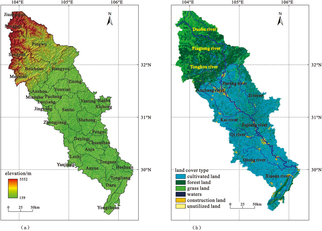 Figure 1. Digital elevation and land cover types in the Fujiang River Basin. (a) Digital elevation of Fujiang river basin. (b) Land cover type of Fujiang river basin.