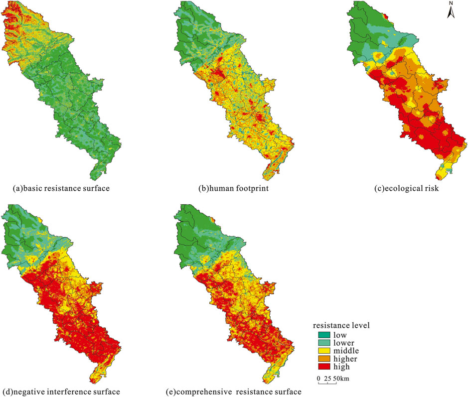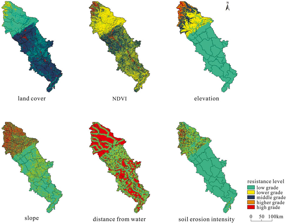 where E is the comprehensive evaluation result of basic resistance, an is the weight of each evaluation factor, and xn denotes the ecological resistance grade value of each evaluation factor.