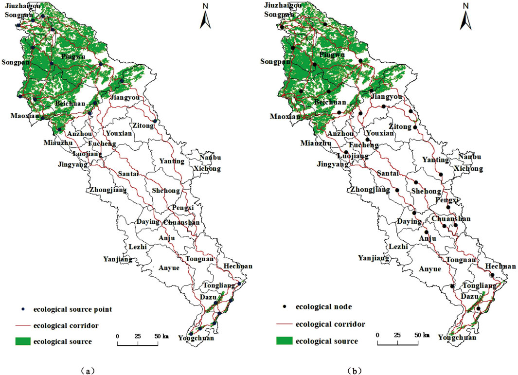 Figure 5. Ecological corridors and ecological nodes in the Fujiang River Basin. (a) ecological corridors (b) ecological nodes.
