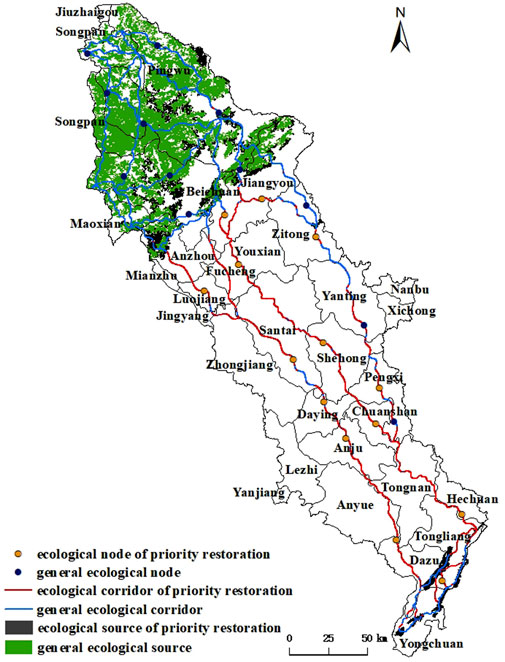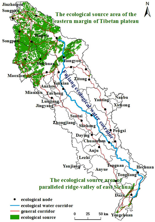 The Fujiang River originates from Xuebaoding, the main peak of Minshan Mountain, flows through the hills and plains of the Sichuan Basin, and flows into Jialing River in Chongqing. The Fujiang River is a cross-border river between Sichuan Province and Chongqing City. Therefore, to restore the priority areas for ecological restoration in the Fujiang River Basin, it is necessary to enhance cross-regional collaboration and jointly build an “ecological community” in the Fujiang River Basin, so as to make the Fujiang River Basin a green background for the construction of the Chengdu-Chongqing Economic Circle. Considering the ecological base and spatial distribution of constituent elements of ecological security pattern in the study area, the targeted restoration strategies were proposed from three perspectives: point (ecological nodes), line (ecological corridors) and surface (ecological sources).