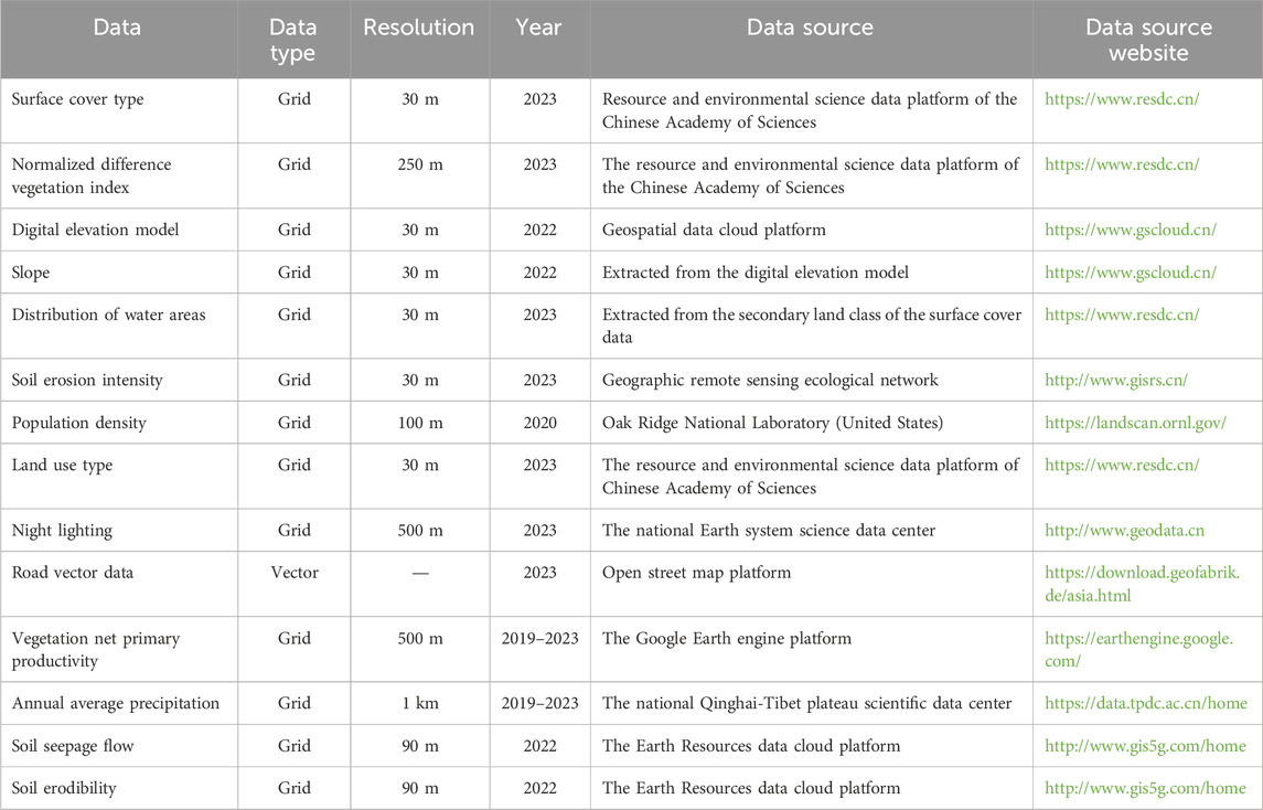 The basic data used in this study included surface cover type, normalized difference vegetation index, digital elevation model, slope, the distribution of roads and water areas, soil erosion modulus, soil seepage flow, land use type, population density, night light, net primary productivity of vegetation, and multi-year average annual precipitation. The following data types, sources, and other information were used (Table 1).