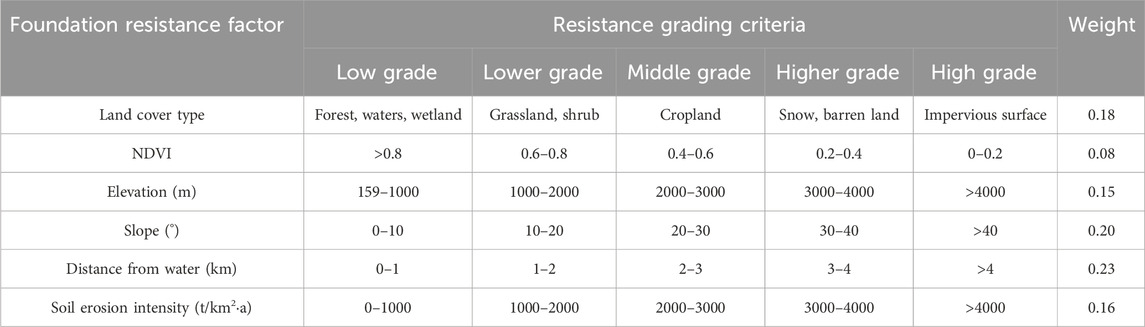Ecological resistance serves as an ecological obstacle that must be overcome for species migration, energy flow and information transfer between sources, with natural factors serving as the basic source of resistance to the diffusion of material and energy between sources (Tu et al., 2022; Yan et al., 2025). According to the ecological status of the Fujiang River Basin, six natural factor indicators, namely, the elevation, slope, surface cover type, normalized difference vegetation index, the distance from water areas, and soil erosion intensity, were selected and reclassified into five grades. The spatial principal component analysis was used to determine the weight value of each evaluation factor, and the ecological resistance values of each factor were weighted and superimposed. On this basis, the basic resistance surface of the Fujiang River Basin was constructed.