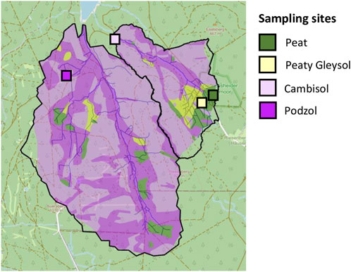 Figure 1. Map of the catchment area of the Sosa drinking water reservoir in the Ore Mountains (Germany). The sampling sites are indicated by squares, indicating also the soil type. The color scheme on the map illustrates the soil type distribution along the catchment area, Peat represented by green, peaty Gleysol by light-yellow, Cambisol by lilac, and Podzol by purple, which matches the color of the sampling sites.