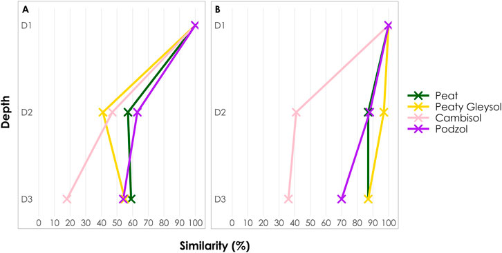 Figure 2. Changes in pair-wise similarity, according to the Bray-Curtis dissimilarity analysis, in percentage of DOM composition along soil profiles (Peat, peaty Gleysol, Cambisol, Podzol) considering the relative abundance of the identified chemical compounds derived from Py GC/MS (A) and optical indices from absorbance and fluorescence (B). Depth 1 = D1, depth 2 = D2 and depth 3 = D3.