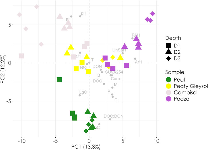 Figure 3. Results of the principal component analysis (PCA) of the parameters analyzed (dots in gray color) in this study for all the sites (Peat, peaty Gleysol, Cambisol and Podzol) at depth 1, 2 and 3 (D1, D2 and D3, respectively). FI = fluorescence index, B = tyrosin-like peak, T = tryphtophan-like peak, A = humic-like peak (recent material), M = microbial by-product peak, C = humic-like peak, SUVA254 = absorbance at 254 nm, ArH = aromatic hydrocarbon, Carb = carbohydrate, LgC = lignin compound, Ntg = nitrogen containing compound, PAH = Polyaromatic hydrocarbon, PhC = phenolic compound, SaH = saturated hydrocarbon, UnSaH = unsaturated hydrocarbon. The PCA also considered the relative abundance of all the chemical compounds, however, it is not shown in the figure to improve its readability.