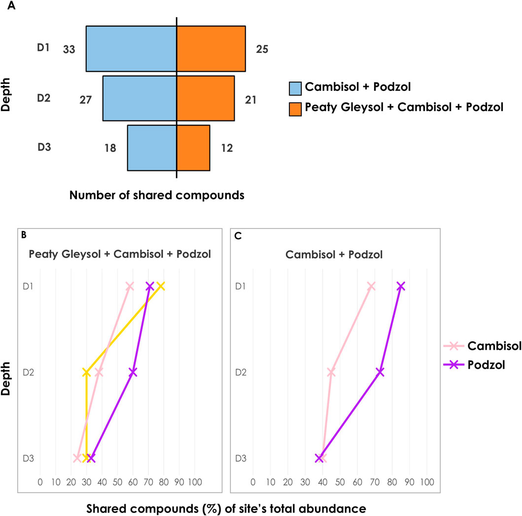 Figure 4. (A) Bar chart of the numbers of shared individual compounds in dissolved organic matter (DOM) samples of soils with mineral subsoils (Cambisol and Podzol, represented by blue color) and peaty Gleysol, Cambisol, and Podzol, represented by orange color, at different depths. The line plots represent the contribution (%) of shared compounds to total DOM in each soil at each depth using two approaches (B) mineral soils (i.e., Cambisol and Podzol) and (C) all soils that contain mineral subsoils (i.e., peaty Gleysol, Cambisol, Podzol). D1 = depth 1, D2 = depth 2, D3 = depth 3.