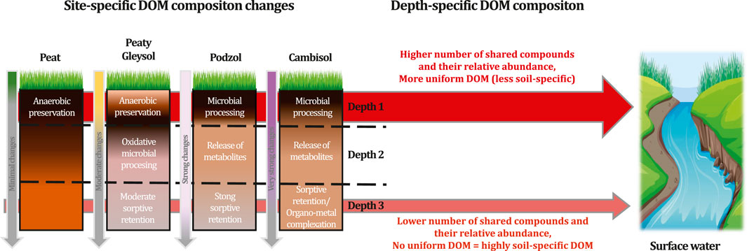 DOM undergoes significant changes as it moves through soil profiles, with its composition, concentration, and molecular structure evolving in response to various transformation and sorption processes. Biodegradability is an important factor, as microbial communities can utilize DOM compounds as sources of carbon and energy (Kellerman et al., 2015; Kalbitz et al., 2003). Selective microbial processing generates distinct vertical patterns in DOM composition, often leading to the progressive depletion of relatively labile components while more recalcitrant compounds residually enrich. In addition, sorption continuously modifies DOM composition along flow pathways via interactions with mineral surfaces (Kalbitz et al., 2005). Sorption is compound-selective and is based on properties such as aromaticity, functional groups, and molecular weight (Feng et al., 2005). Sorption, therefore, not only alters DOM composition directly but can also protect certain compounds from microbial degradation (Kleber et al., 2015). The formation of soluble organo-metal complexes, especially with iron and aluminum, further modifies DOM mobility and bioavailability, with complexation rates affected by pH, redox state, and competing cations (Xu and Tsang, 2024; Yang et al., 2024; Roberts et al., 2005). Under certain conditions, many of these complexes are insoluble, leading to precipitation and accumulation in specific soil horizons (Krettek and Rennert, 2021; Wagai et al., 2020). During periods of water saturation, reduced oxygen availability may limit microbial degradation of certain compounds, thereby promoting the preservation also of potentially labile DOM components (Roth et al., 2019). Moreover, hydrological flow conditions influence the balance between biological and sorptive processes, affecting DOM transformation during the soil passage. The overall residence time of water at different soil depths plays a critical role in determining the type and extent of DOM alteration. Thus, understanding how DOM composition is affected by these transformations along soil profiles is crucial for linking soil DOM with aquatic systems and for predicting DOM mobility, persistence, and ecological impacts across terrestrial-aquatic interfaces.