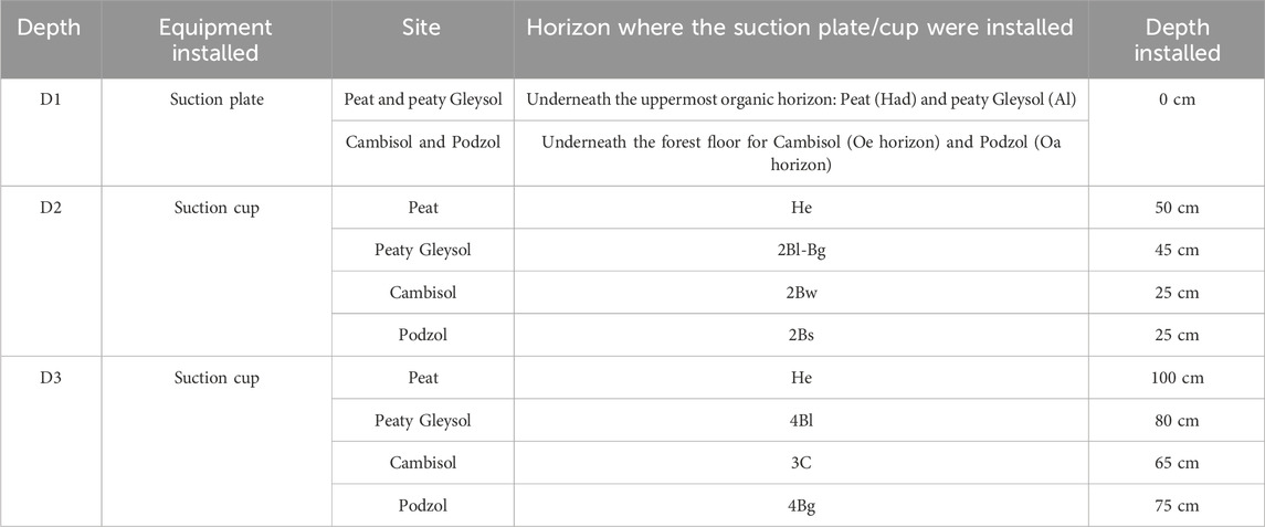 Table 1. Installation details of soil water sampling equipment (suction plates and cups) at different depths (D1, D2 and D3) across four soil types (Peat, peaty Gleysol, Cambisol, and Podzol). Horizon designations and their respective depths are detailed in the Supplementary Material.