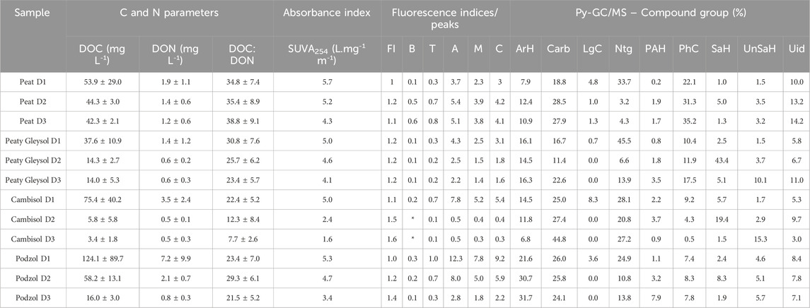 Table 2. Dissolved organic matter characterization: 1) DOC and DON concentrations, DOC:DON ratio; 2) relative intensity of the absorbance and fluorescence indices, where SUVA254 = specific absorbance at 254 nm, FI = fluorescence index, B = tyrosin-like peak, T = tryphtophan-like peak, A = humic-like peak (recent material), M = microbial by-product peak, C = humic-like peak; 3) Py-GC/MS identified data as a percentage of compound group found in the soil water samples of different soils (Peat, peaty Gleysol, Cambisol, Podzol) at different depths (D1 = depth 1; D2 = depth 2; and D3 = depth 3). ArH = aromatic hydrocarbons, Carb = carbohydrates, LgC = lignin-derived compounds, Ntg = nitrogen containing compounds, PAH = Polyaromatic hydrocarbons, PhC = phenolic hydrocarbons, SaH = saturated hydrocarbons, UnSaH = unsaturated hydrocarbons, Uid = unidentified (i.e., unknown origin).