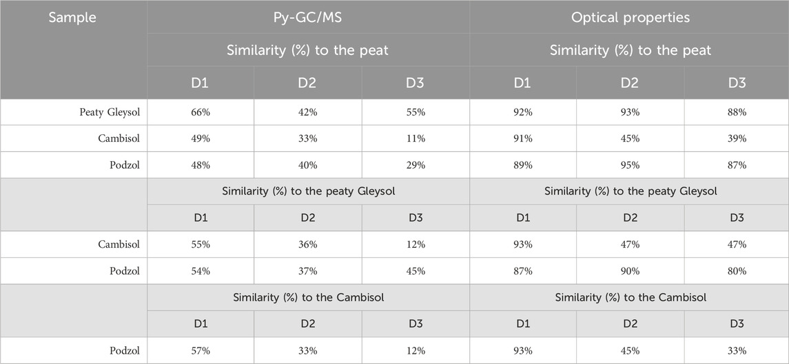 Similarities of the optical properties (Table 3) remained fairly high for most of the pair-wise comparison among the different soil types (80%–93%). The lowest similarities were observed with the Cambisol at D2 and D3 (Peat-Cambisol: 45% and 39%, respectively; peaty Gleysol-Cambisol: 47% and 37%, respectively; and Podzol-Cambisol: 45% and 33%, respectively).