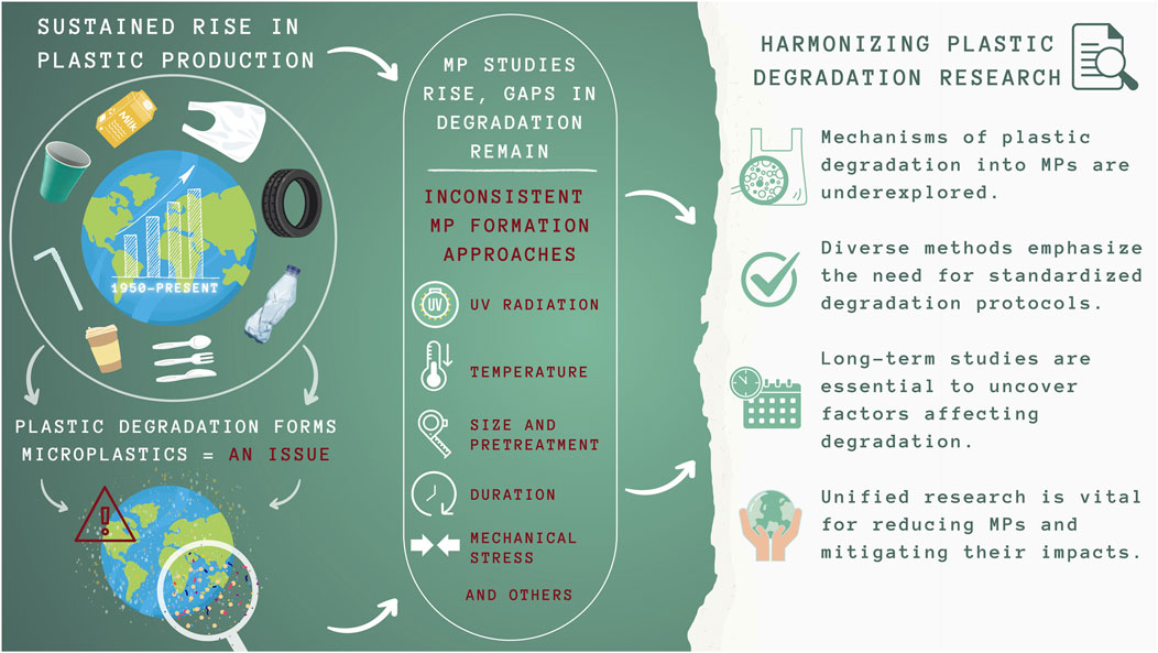 The presence of microplastics raises concerns due to their persistence, small size, and ability to adsorb and transport toxic compounds (Bradney et al., 2019; Hoang et al., 2025; Joo et al., 2021; Stapleton and Hai, 2023; Xi et al., 2022). The fact that they have been detected in human tissues and fluids–including blood, urine, placenta, and even amniotic fluid–raises concerns about potential systemic exposure pathways (Abbas et al., 2025; Halfar et al., 2023; Massardo et al., 2024; Ragusa et al., 2022; Rotchell et al., 2024). While research has increasingly focused on documenting microplastics and their impacts, less attention has been given to the degradation processes that generate them.