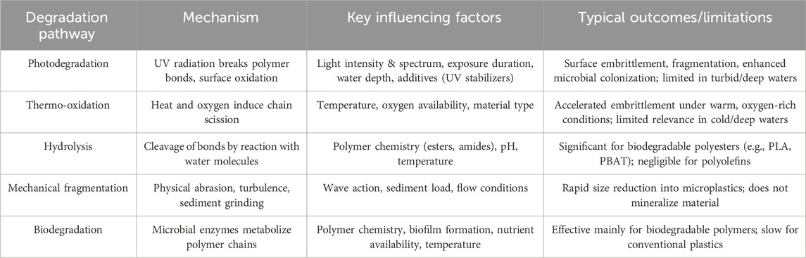 Five major mechanisms are typically involved: photodegradation, thermo–oxidation, hydrolysis, mechanical fragmentation, and biodegradation. Their activity depends on multiple environmental factors, including UV radiation, temperature, oxygen and salinity levels, water turbulence, and pH (Cai et al., 2023; Lin et al., 2022; Schwarz et al., 2023). These factors often act synergistically; for example, UV exposure can oxidize polymer surfaces, making them more brittle and thus more susceptible to fragmentation and microbial attack (Dey et al., 2024; Niu et al., 2023).
