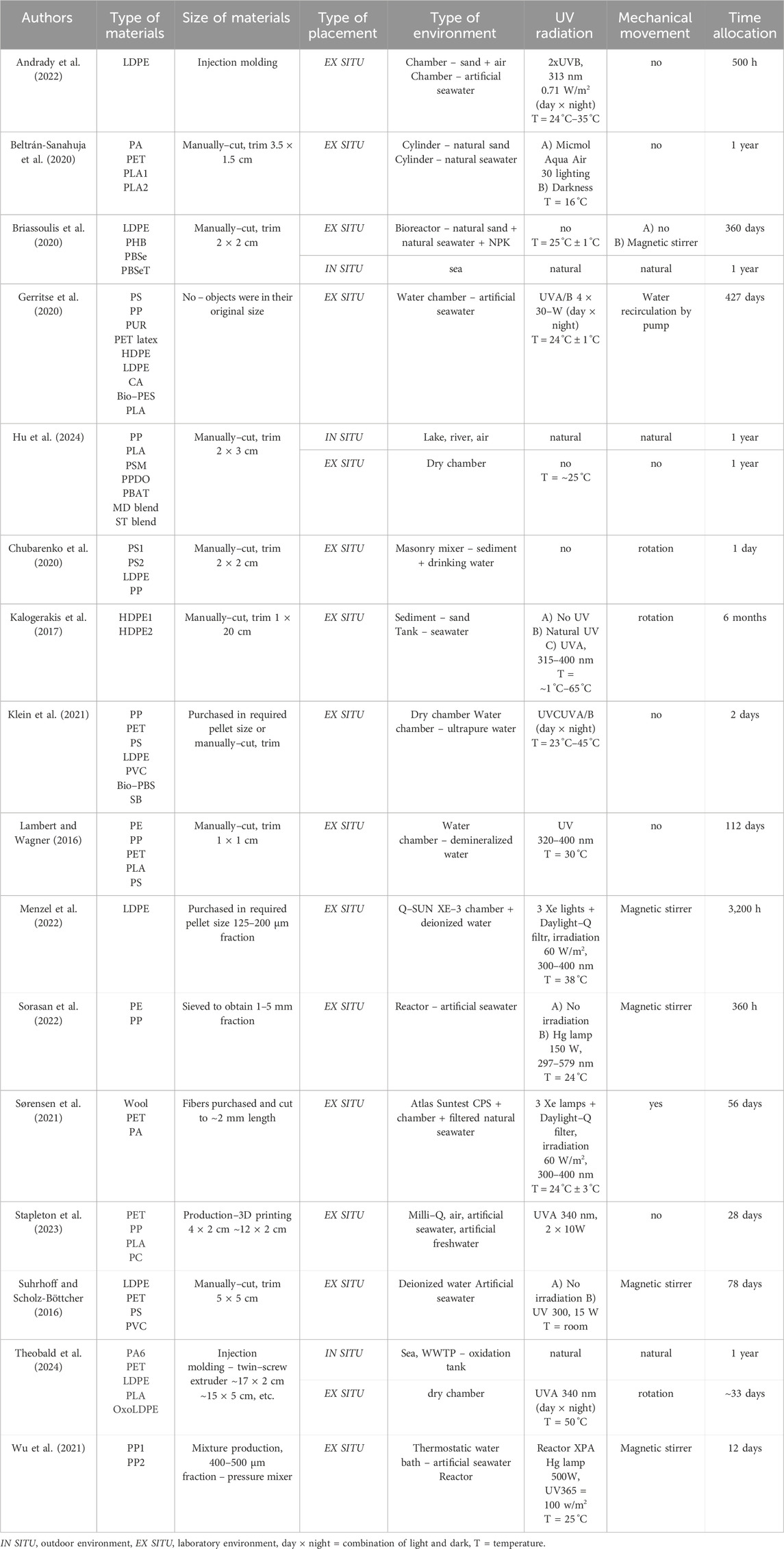 The degradation of plastics in aquatic systems has been investigated in both laboratory (ex situ) and natural (in situ) settings. However, the available experimental studies differ significantly in their methodological designs. Variables such as polymer type, particle size, UV source and intensity, water chemistry, duration, and mechanical agitation vary widely across experiments (Klein et al., 2021; Lambert and Wagner, 2016; Theobald et al., 2024). This heterogeneity severely limits the comparability and reproducibility of results.