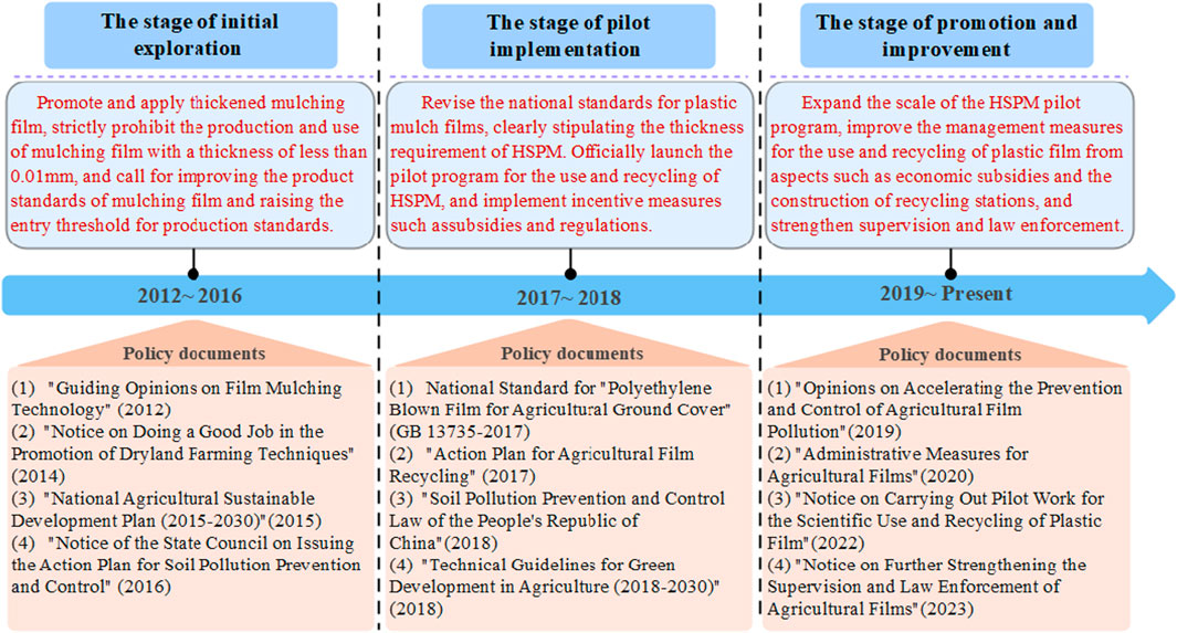 Compared with traditional thin mulch film, high-standard plastic mulch (HSPM) is thicker (exceeding 0.01 mm) and offers significant advantages in terms of increasing temperature and moisture retention, optimizing water and fertilizer utilization, ensuring soil nutrition, and increasing crop yields (Hu et al., 2019). Furthermore, HSPM has impressive tensile durability and weather resistance, so it is less prone to breakage or decomposition and facilitates recycling efforts that can substantially mitigate the pollution from residual film (Zhang et al., 2017; Li et al., 2021a). Consequently, the re-establishment of production standards alongside initiatives to promote HSPM usage and recycling among farmers has emerged as a critical strategy employed by the Chinese government to combat “white pollution” at its source (Zhang et al., 2019; Xie et al., 2023). The central government revised the national standard for Polyethylene Blow Plastic Agricultural Mulch Covering Film (GB 13735-2017) for the first time in 2017; this standard stipulates that the minimum thickness of mulch should not be less than 0.01 mm. In the same year, the Ministry of Agriculture and Rural Affairs (MARA) issued the “Action Plan for Agricultural Film Recycling”, which focused on launching HSPM pilot projects to promote adoption and recycling in Gansu, Xinjiang and Inner Mongolia. In 2022, the MARA and the Ministry of Finance jointly issued the “Notice on Launching Pilot Work on Scientific Use and Recycling of Agricultural Film” (hereinafter referred to as the “Notice”), explicitly stating that pilot initiatives would be further expanded with the aim of promoting HSPM application across more than 200 million mu (13.33 million hectares) by 2025 while increasing the national agricultural film recycling rate to over 85%. To ensure the effective implementation of this pilot policy and facilitate both the adoption and recycling of HSPM, supporting measures, including economic subsidies and governmental regulations, have been established by the central government (Wang et al., 2018). The specific policy evolution timeline is presented in Figure 1.