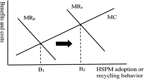 According to classical microeconomic principles, rational people’ behavior follows the principle that marginal benefits are equal to marginal costs. In reality, however, marginal benefits and marginal costs are often not entirely private (Coase, 2013). Compared with traditional thin plastic mulch, HSPM is durable, water resistant and easy to recycle. Its adoption not only promotes increased production and income but also helps reduce pollution and improve the rural ecological environment (Zhang et al., 2017). However, the benefits of environmental improvement extend beyond the farmers who adopt and recycle. As depicted in Figure 3, the individual marginal benefit (MRP) experienced by farmers when they adopt and recycle HSPM is significantly less than the societal marginal benefit (MRS) they gain from the improvement of ecological conditions. Considering the maximization of social welfare, the ideal HSPM adoption and recycling behavior should be B2 (MRS equals social marginal cost). However, in reality, farmers only adopt and recycle HSPM at the B1 level (much lower than B2) to maximize their personal benefits. This leads to the classic free-rider problem, in which farmers are unwilling to actively adopt and recycle HSPM (Xie et al., 2023). However, this problem can be effectively solved through the use of market tools, that is, by providing economic subsidies to farmers and internalizing the social marginal benefits brought by their behaviors (De Lucia and Pazienza, 2019). As shown in Figure 3, by providing subsidies, the MRP curve can be shifted to the right until it coincides with the MRS curve, resulting in an increase in farmers’ adoption and recycling behavior of HSPM from B1 to B2. This subsidy, in the adoption stage, can at least compensate farmers for the extra cost of replacing plastic mulch. In the recycling phase, this subsidy can compensate for the various expenses involved in the recycling procedure and the decrease in leisure time utility (Li et al., 2023). Thus, the following hypothesis is proposed in this study: