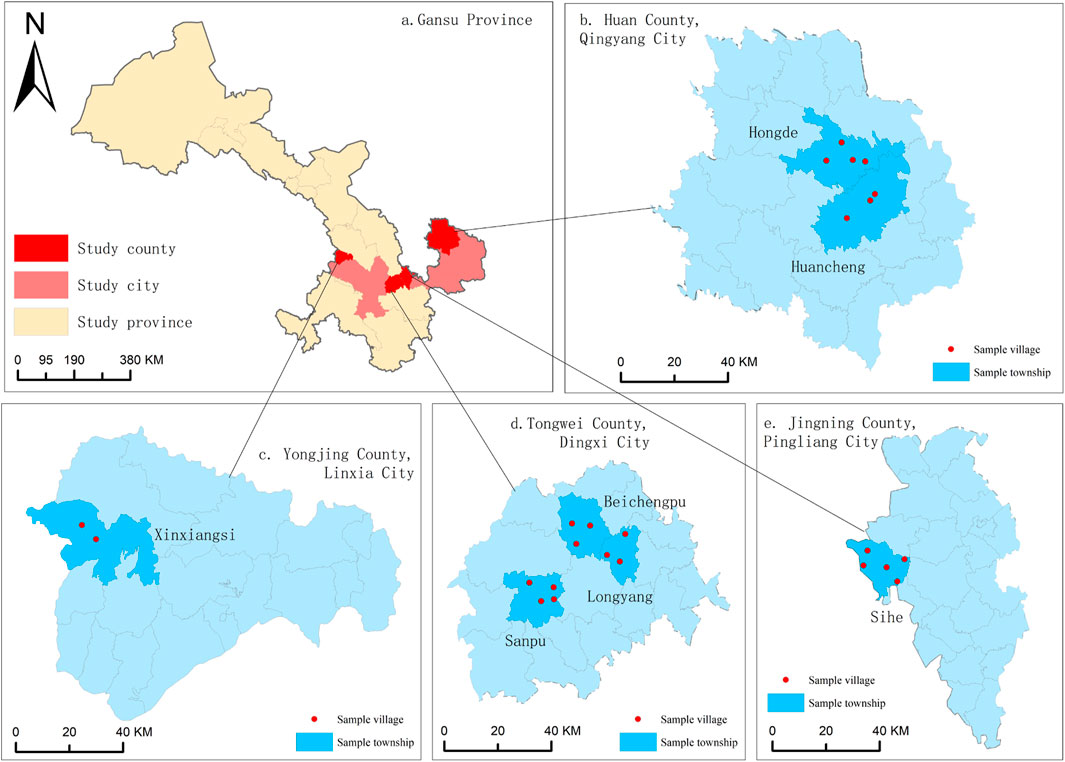 In this study, the stratified random sampling method was used to obtain survey samples. First, four cities in Gansu Province, namely, Qingyang, Dingxi, Pingliang, and Linxia, were randomly selected as research areas on the basis of their level of economic development and use of plastic mulch. In each city, one demonstration county of HSPM use and recycling, which included Huan, Tongwei, Jingning and Yongjing, was selected as the sample county. Second, 1–3 pilot towns in each pilot county, along with 3–5 administrative towns within villages in each town, were selected. Third, 20–30 rural households were randomly selected from each sample village for household surveys. The sample selection involved nearly 650 farmers from 24 villages across 7 towns and 4 counties within Gansu Province. A total of 640 farmers were surveyed, and after excluding incomplete questionnaires, 635 valid responses were retained, yielding an effective response rate of 96.87%. All retained questionnaires were complete, with no missing values. The distribution of specific sample points is shown in Figure 5.