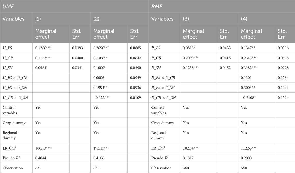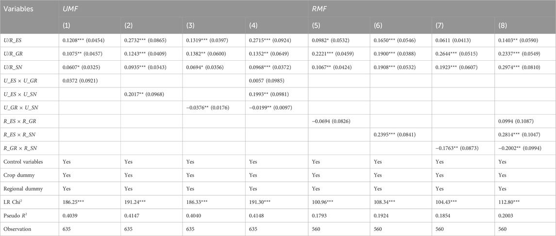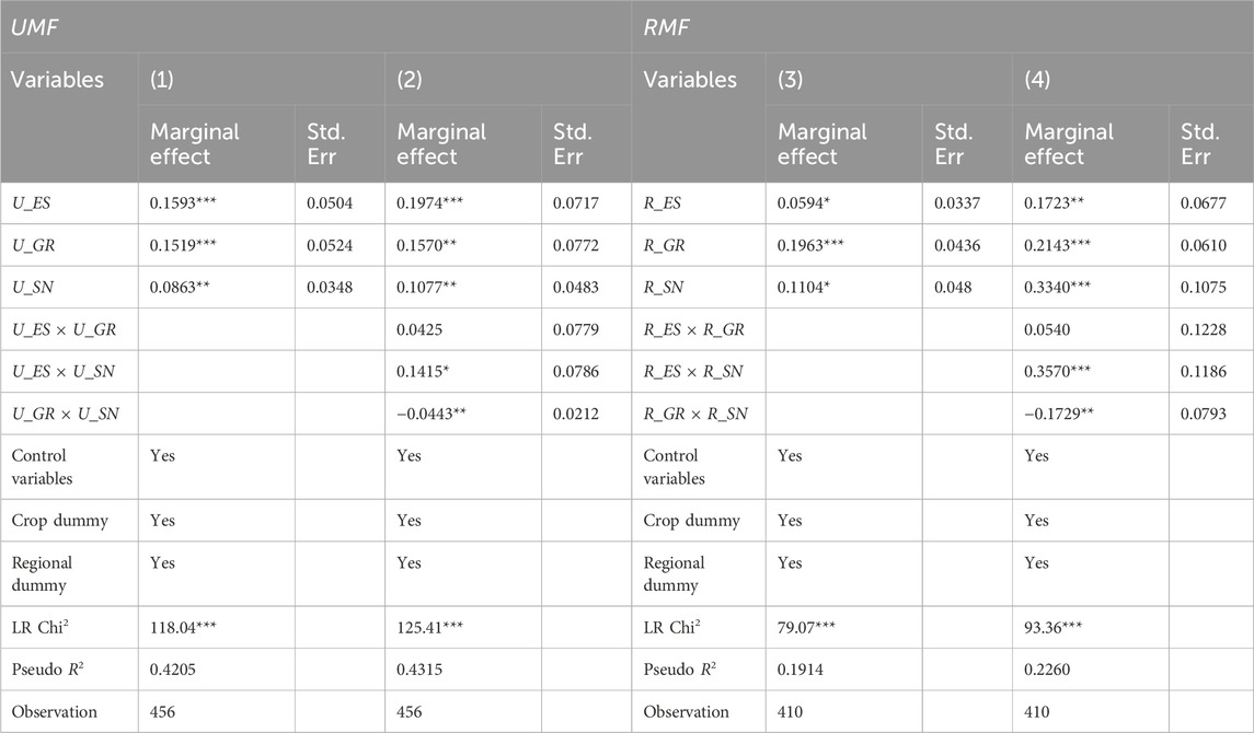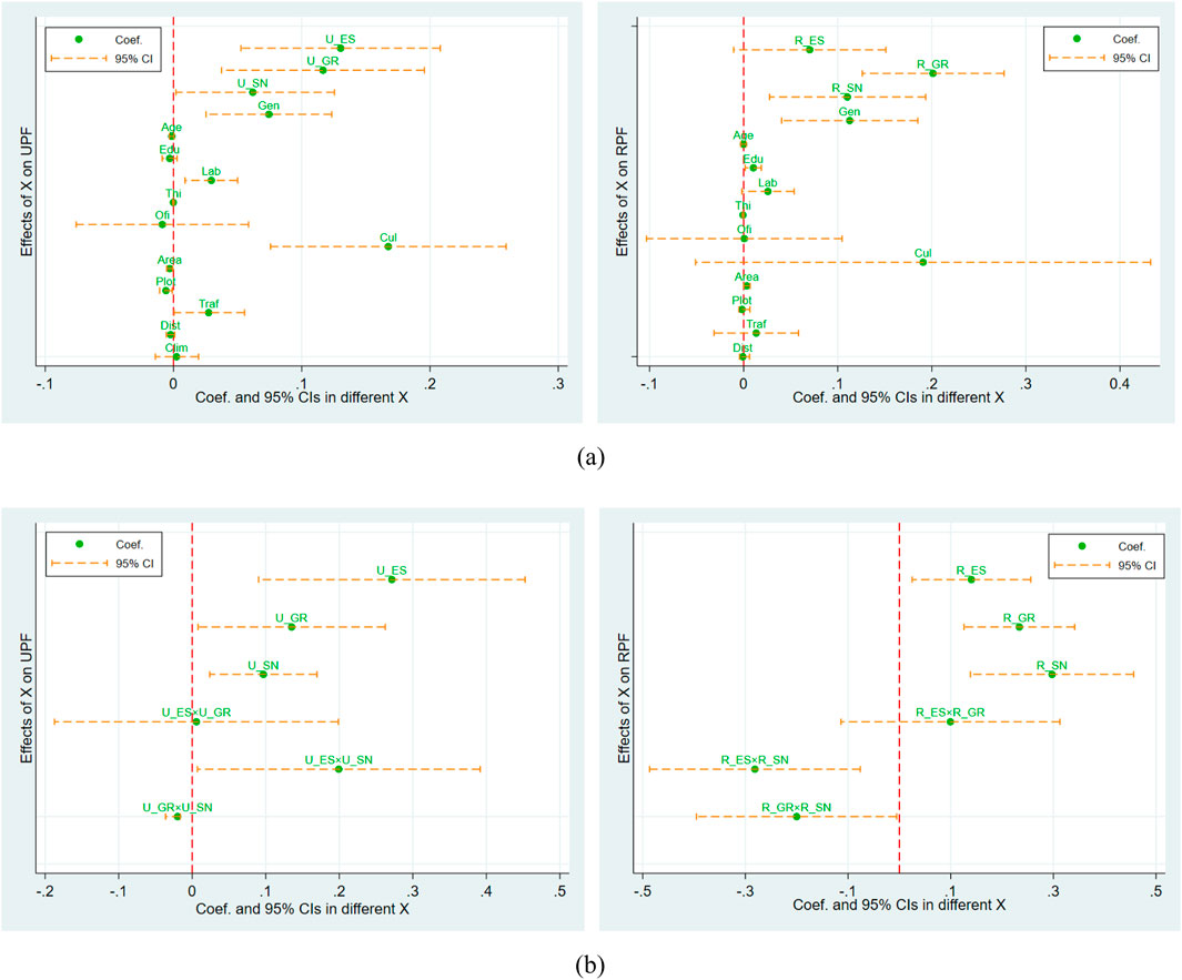 Economic subsidies, government regulations and social norms can still effectively encourage HSPM adoption and recycling after interaction items are included. Table 3 shows that, in the adoption behavior equation (Columns (1) ∼ (4)), the coefficient of “U_ES × U_SN” is significantly positive, suggesting that economic subsidies and social regulations are complementary, which also means that the positive effects of these two measures on farmers’ HSPM adoption behavior can amplify each other. The coefficient of “U_GR × U_SN” is significantly negative, indicating that there is an alternate relationship between government regulations and social norms in incentivizing HSPM adoption behavior. The coefficient of “U_ES × U_GR” is positive, but it does not pass the z test, which means that the interaction between government regulations and economic subsidies is not observed.