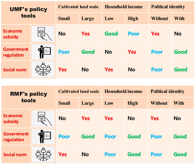 The specific relationships among policy tools and farmer types are shown in Figure 7. “No” denotes no effect, “Yes” indicates the presence of an effect, “Poor” signifies minor effect, and “Good” represents substantial effect.