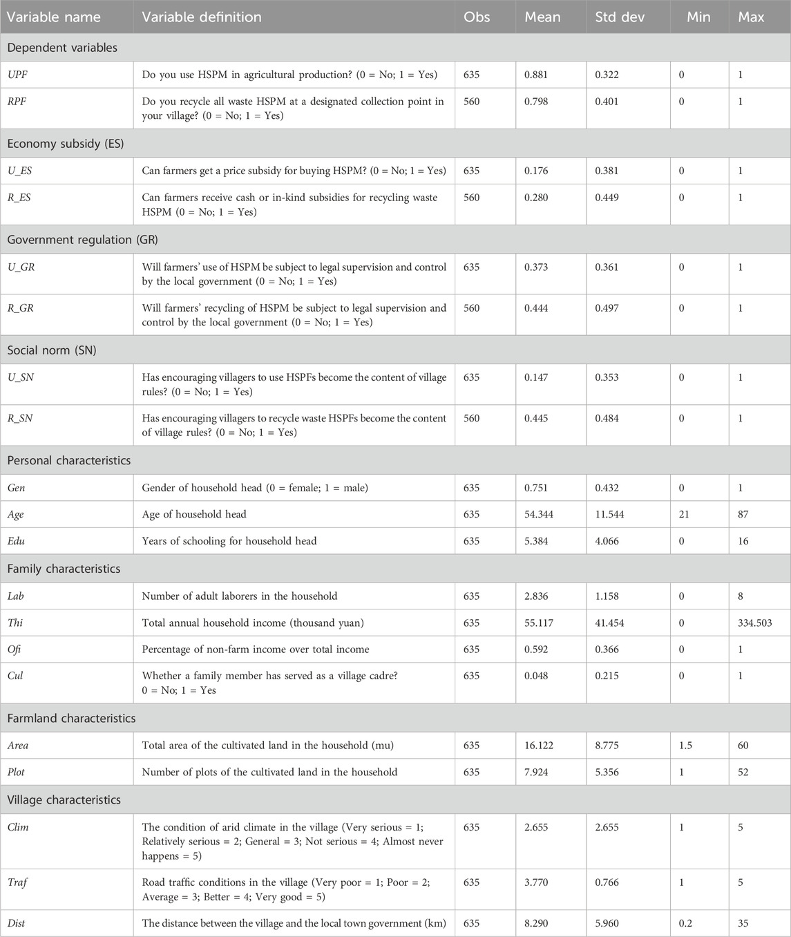 However, scholars have debated the efficacy of these supportive measures. On the one hand, some researchers contend that, bolstered by economic subsidies and government regulations, China’s efforts to control rural ‘white pollution’ have proven effective (Zhang et al., 2019), with the practical application of HSPM expanding and film recycling rates in pilot regions (Gansu, Xinjiang, and Inner Mongolia) consistently exceeding 80% (Zhang and Quan, 2022). On the other hand, many scholars argue that the anticipated incentive effects of these supporting measures are limited or even ineffective due to operational challenges such as unreasonable subsidy standards, inadequate supervision and enforcement (Wang et al., 2018; Liu et al., 2023), and ongoing illegal usage and disposal practices by farmers (Zhang, 2020; Li, 2022). Thus, the state of agricultural film pollution in China remains dire (Pang and Jin, 2023). Furthermore, some other academics argue that while supporting measures may not be entirely ineffective, their incentive effects can vary significantly. Compared with village leaders and large-scale farmers, ordinary farmers and smallholders often experience diminished incentives due to information asymmetries coupled with high monitoring and enforcement costs (Wang et al., 2018).