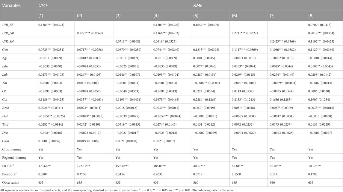 Subsample regression: Eliminate the samples of elderly people. While the theoretical analysis framework for farmers’ adoption and recycling of HSPM is deemed accurate and scientific, a possibility of uncertainty remains in the results due to subjective factors associated with the variables (Wang et al., 2020). Owing to physical limitations, elderly people in rural areas are no longer able to engage in labor-intensive agricultural activities. However, HSPM adoption and recycling has primarily been targeted at the rural working-age population, which represents a highly physically demanding aspect of agricultural production. In China, individuals aged over 60 are generally classified as elderly, and aging is currently a severe issue in rural areas. Therefore, we re-estimate Columns (4) and (8) in Tables 2, 3 after removing farmers over 60 years old from our sample. The results presented in Table 4 indicate that following the exclusion of the elderly sample, the marginal effects and significance of each core variable exhibit minimal changes, indicating that this study’s conclusion remains robust.