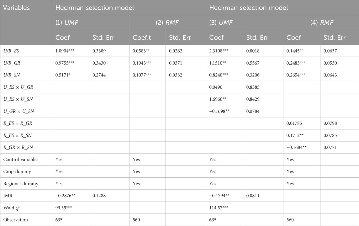 According to previous studies (Wang et al., 2020), there may be selection bias in the analysis of plastic mulch recycling behavior because, in the recycling behavior equation, we only analyzed farmers who had already adopted HSPM, but these farmers were not randomly selected. In fact, they are highly aware of environmental protection and are more likely to recycle plastic mulch because of the impact of core independent variables such as economic subsidies. For this reason, the Heckman two-stage selection model is used to test and cope with possible sample selection bias. The Heckman selection model relies on two key assumptions. First, it assumes the presence of a selection mechanism that may cause sample selection bias if uncorrected. This is modeled through a selection equation and an outcome equation. Second, it requires the error terms of the two equations to be jointly normally distributed, allowing the estimation of the correlation between them. To test these assumptions, the Inverse Mills Ratio (IMR) derived from the selection equation is included in the outcome equation. A statistically significant coefficient on the IMR indicates the existence of selection bias and justifies the use of the Heckman model. Conversely, an insignificant coefficient suggests that selection bias may not be a concern, and simpler estimation methods could suffice.