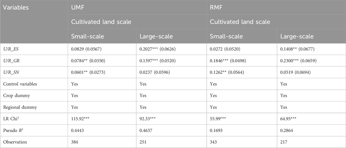 In different farmer groups, these three measures may have different effects on farmers’ HSPM adoption and recycling behavior. The economic subsidies received by farmers are positively correlated with the amount of HSPM adopted and recycled. Thus, large-scale farmers receive more subsidy income than do small-scale farmers and thus have a stronger intention to adopt and recycle HSPM. As the subsidies provided to large-scale farmers are substantial enough to incentivize their adoption and recycling behaviors (Wang et al., 2018), their effectiveness in being bound by social norms is reduced. In contrast, small-scale farmers receive few economic subsidies, which have no magnitude effect, so it is difficult for these subsidies to exert incentive effects on them (Li et al., 2022). At this time, social norms are more conducive to compensating for the limited effectiveness of economic subsidies to better encourage small-scale farmers to adopt and recycle HSPM. Additionally, owing to the different implementation costs and social impacts under control, local governments are more likely to pay attention to the plastic mulch adoption and recycling behavior of large-scale farmers than to that of small-scale farmers. Therefore, large-scale farmers are better constrained by government regulations. Thus, the following hypothesis is proposed in this study: