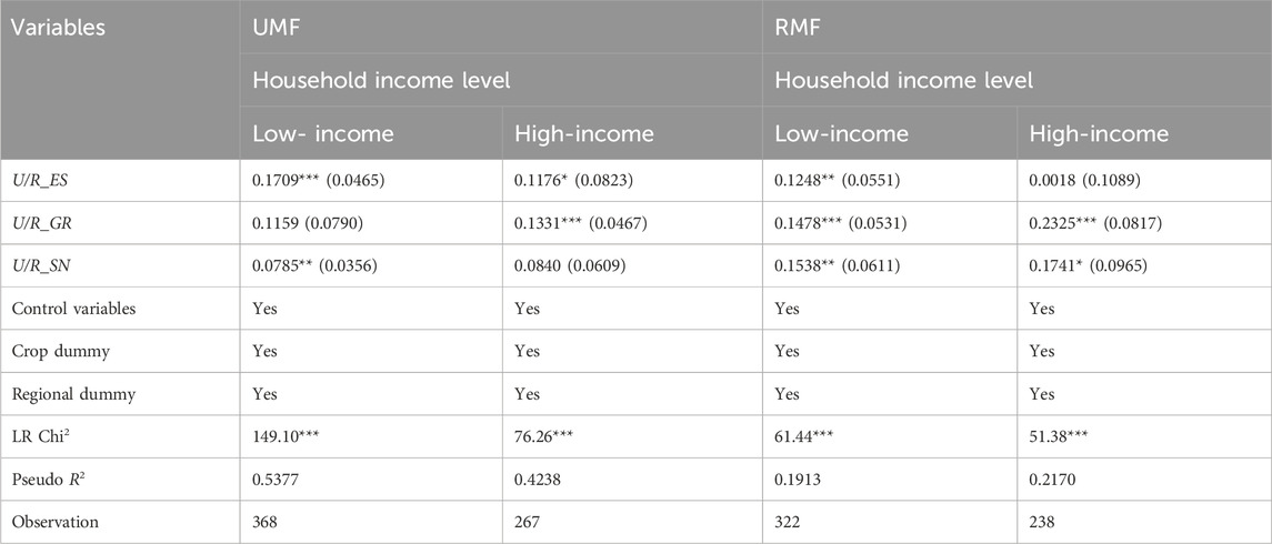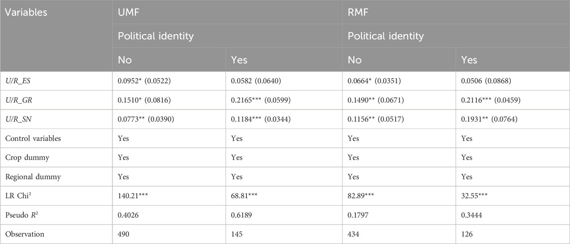 In Table 9, the marginal effect of ES is positive across subsamples, but it only passes the significance test in the group without political identity. The marginal effects of GR and SN pass the significance test and are positive in all subsamples, but their marginal effects are greater in the group with political identity than in the group without political identity. The results show that economic subsidies to encourage HSPM adoption and recycling are effective only for ordinary farmers, whereas government regulations and social norms are more effective for farmers with a political identity, validating Thus, H5c is confirmed. Moreover, the effect of economic subsidies in incentivizing political identity farmers to adopt and recycle HSPM is completely obscured by government regulations and social norms.