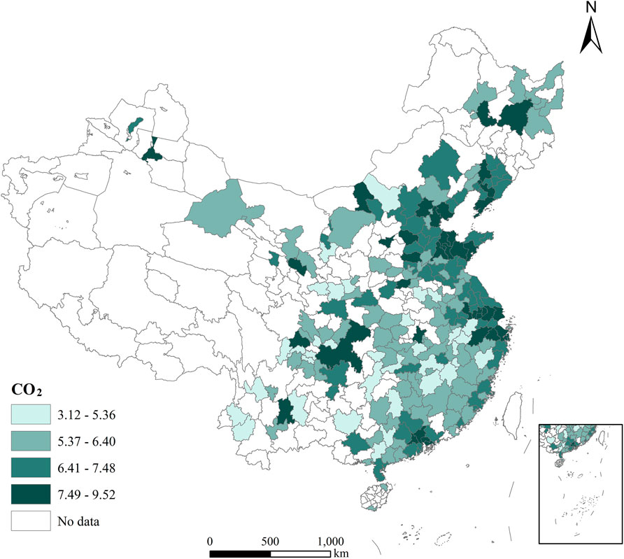 Dependent Variable (CO2): Carbon emissions. Carbon emissions are influenced by urban industrial production, economic structure, and transportation activities etc. The carbon emissions data are sourced from the cities’ CO2 emissions inventory published by the China Emissions Accounts and Datasets (CEADS). The spatial distribution map of carbon dioxide emissions in Chinese Cities is shown in Figure 1.